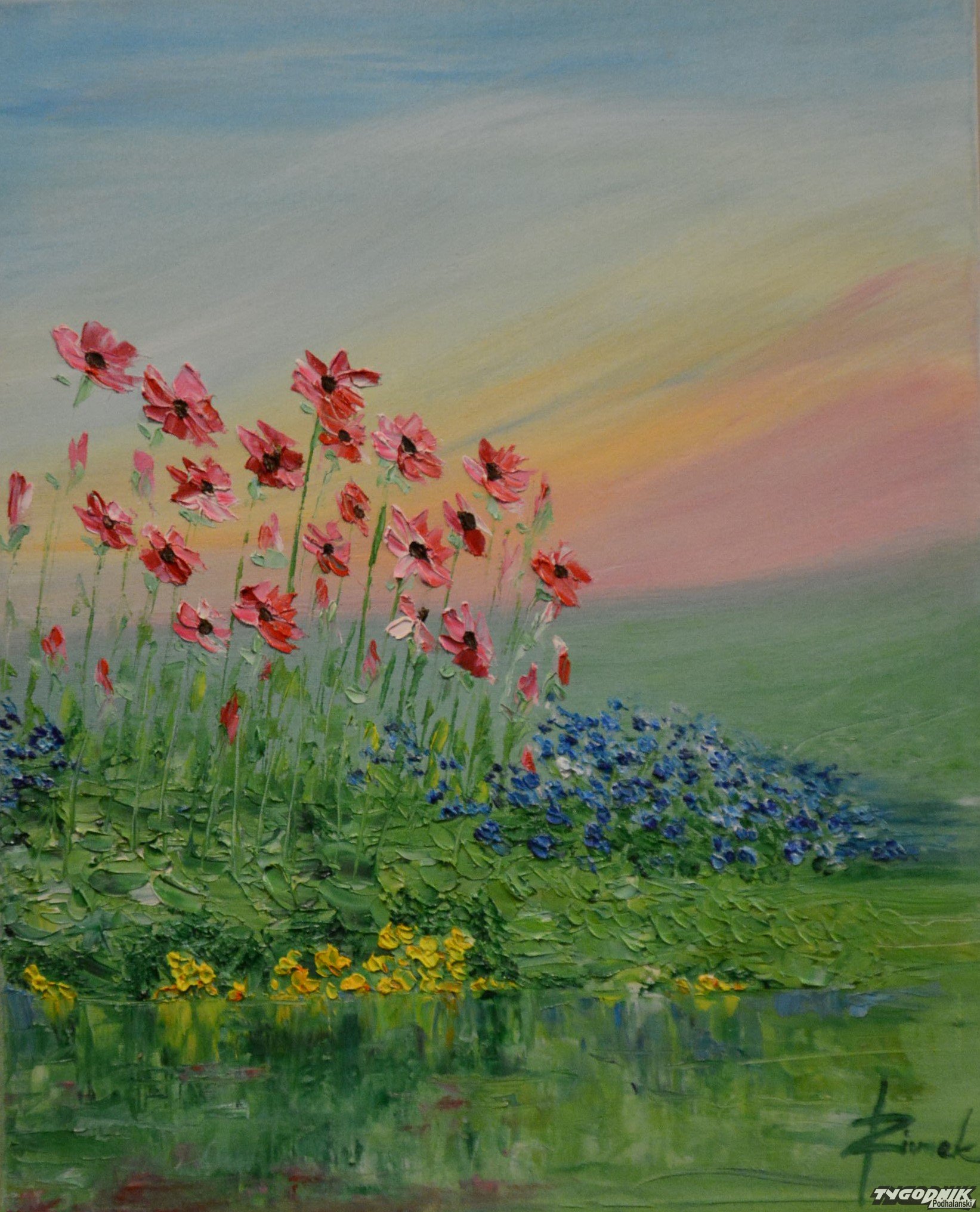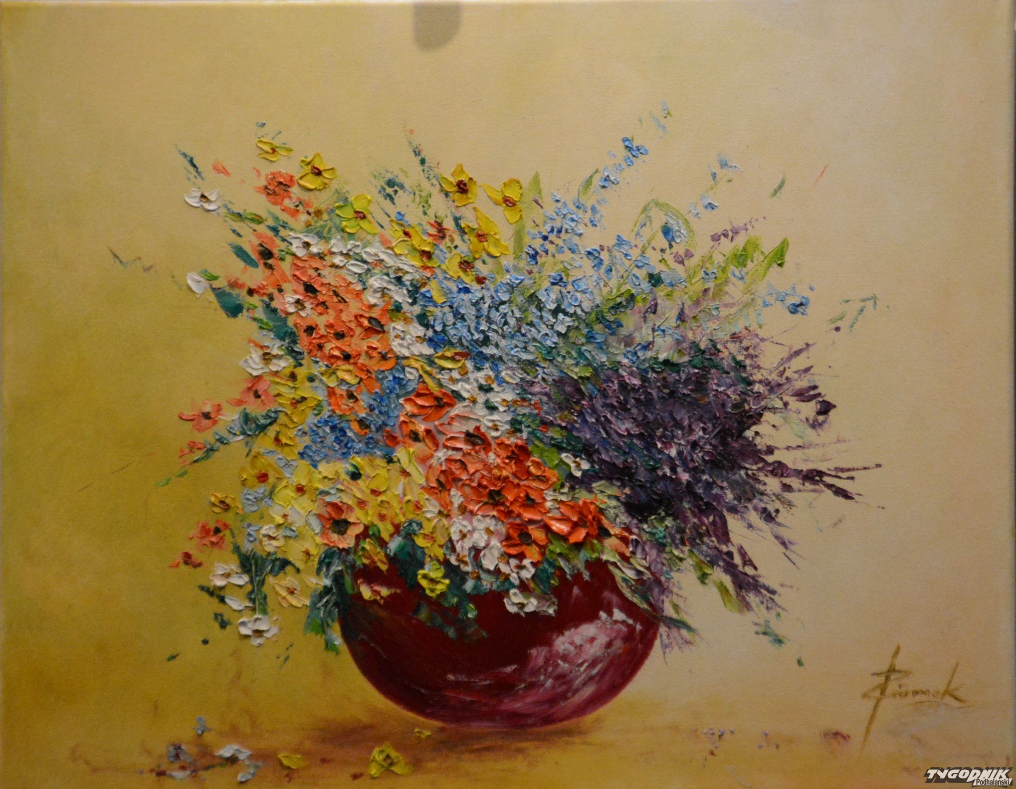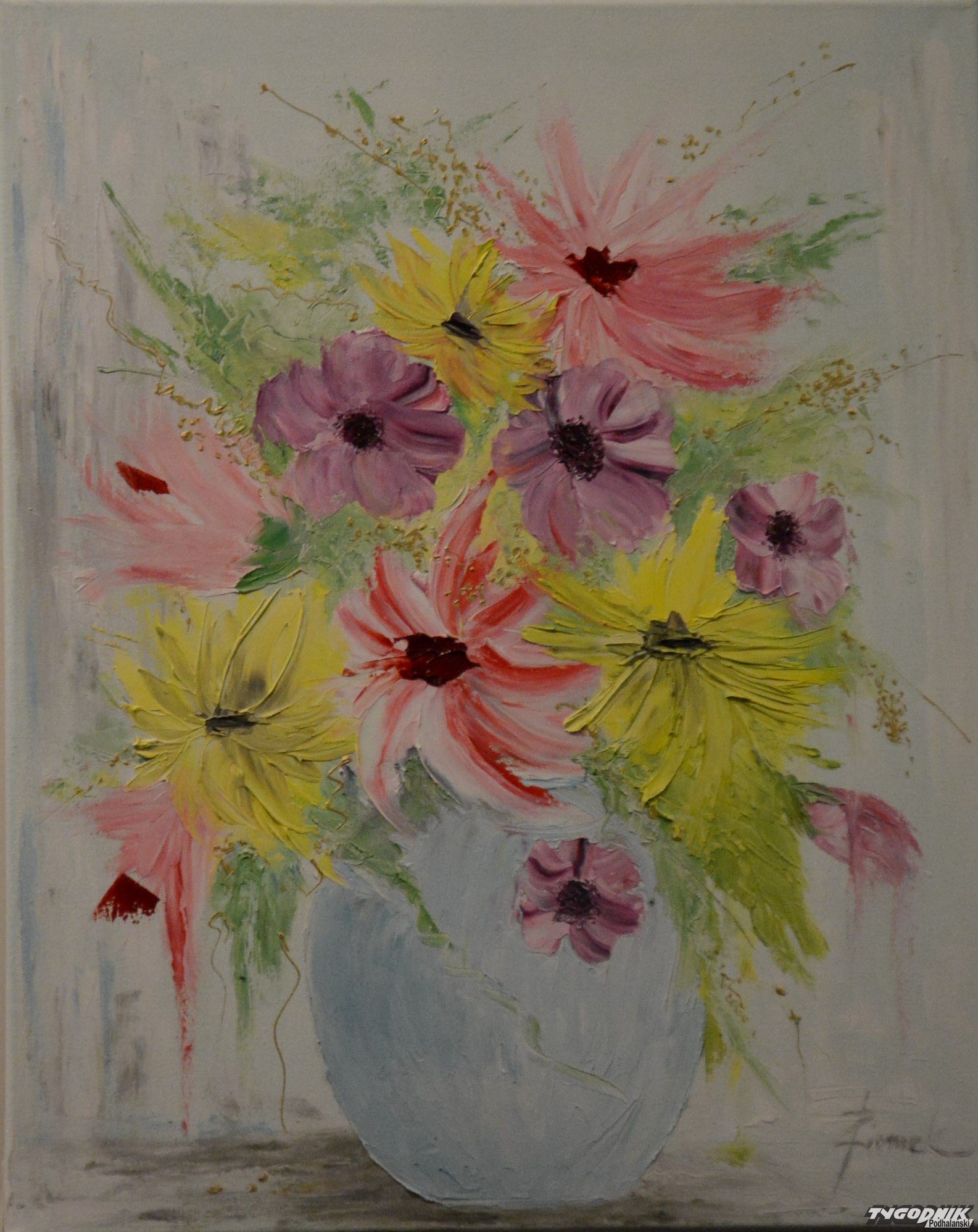Kwiaty na obrazach Joanny Ziomek w zakopiańskiej kawiarni Kmicic.