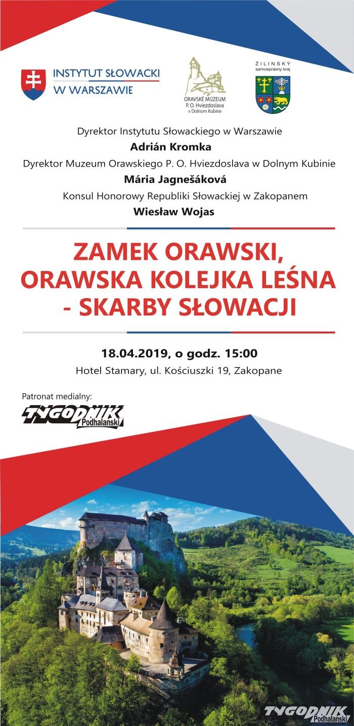 Zapraszają nań: Dyrektor Instytutu Słowackiego w Warszawie Adrián Kromka, Dyrektor Muzeum Orawskiego P. O. Hviezdoslava w Dolnym Kubinie Mária Jagnešáková i Konsul Honorowy Republiki Słowackiej w Zakopanem Wiesław Wojas.