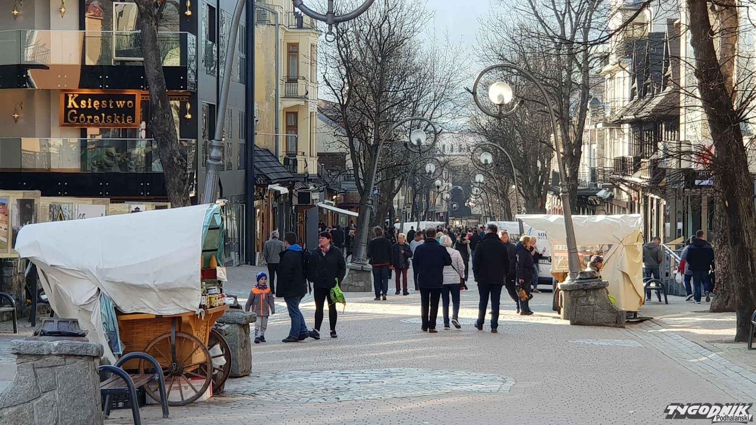 Na Krupówkach nieco tłoczniej niż zwykle w kwietniu. Pierwsi goście spacerują po deptaku. Na prawdziwy turystyczny ruch musimy jednak poczekać do piątku i soboty.