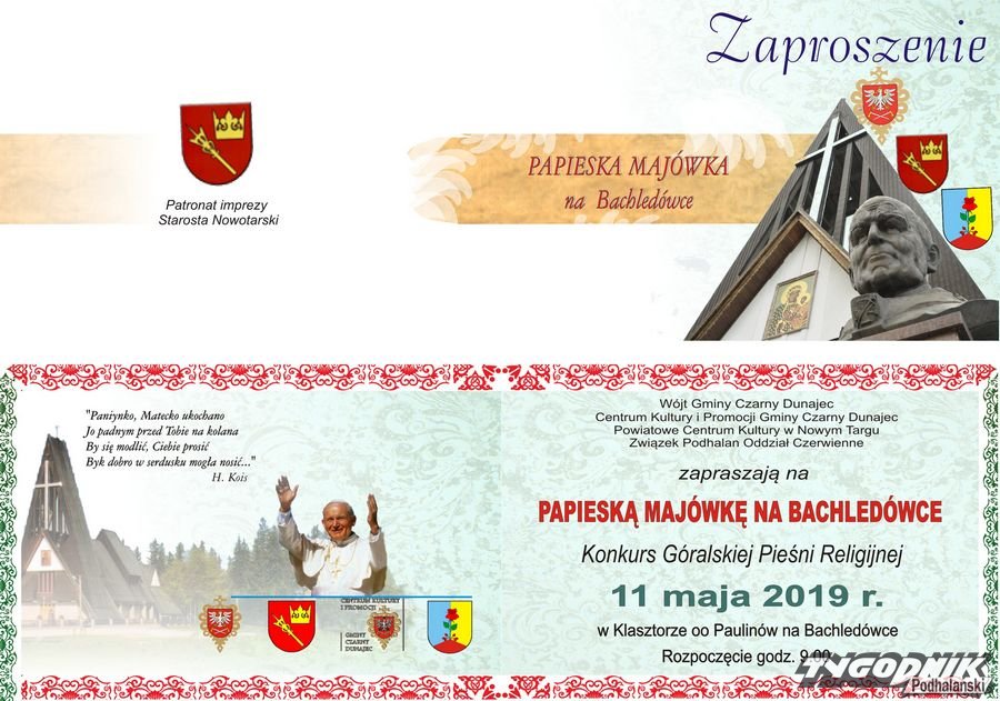 Wójt gminy Czarny Dunajec, gminne Centrum Kultury i Promocji, Powiatowe Centrum Kultury w Nowym Targu i Związek Podhalan oddział Czerwienne zapraszają na Papieską Majówkę na Bachledówce, czyli Konkurs Góralskiej Pieśni Religijnej.