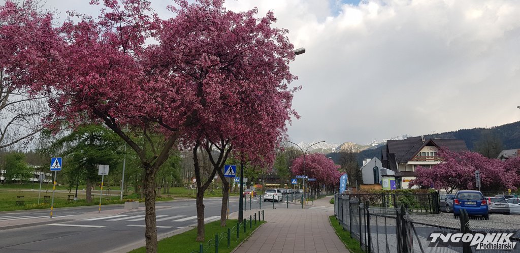 Tak pięknie wyglądają Aleje 3 Maja w Zakopanem. Sezon kwitnienia drzewek owocowych w pełni, co można obserwować przy skrzyżowaniu ul. Staszica z Alejami.