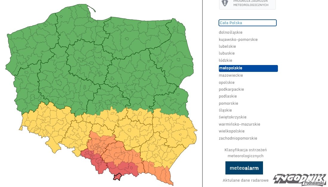 Instytut Meteorologii i Gospodarki Wodnej wydał dla powiatu tatrzańskiego i nowotarskiego ostrzeżenie przed opadami i burzami trzeciego, najwyższego stopnia. Na Podhalu opady mają być silne i umiarkowane. Mocny deszcz zacznie padać w czwartek wieczorem.