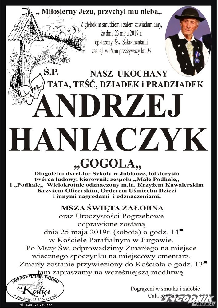 Uroczystości pogrzebowe Andrzeja Haniaczyka rozpoczną się w sobotę 25 maja o godz. 14 w Kościele Parafialnym w Jurgowie.