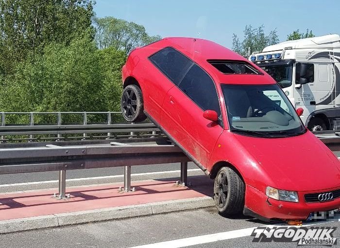 Wymuszenie pierwszeństwa miało spowodować, że czerwone audi wylądowało na barierze oddzielające pasy zakopianki.