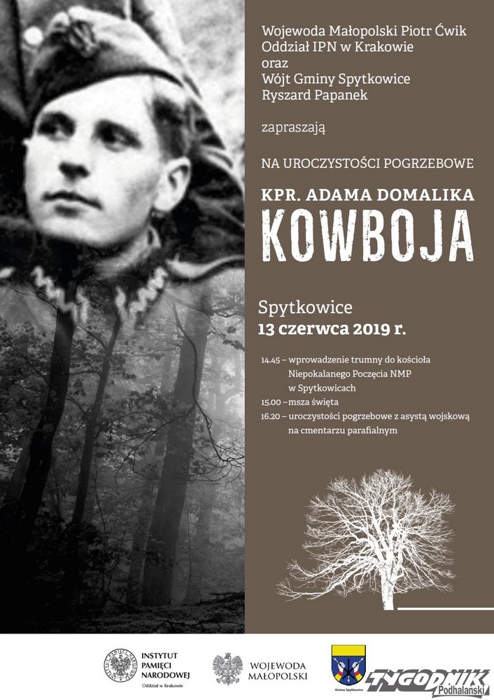 13 czerwca w Spytkowciach odbędą się uroczystości pogrzebowe kpr. Adama Domalika „Kowboja”, żołnierza zamordowanego w 1948 roku w więzieniu przy ul. Motelupich w Krakowie.