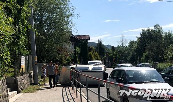 Kolizja z przeszkodą okazała się tak niefortunna, że samochód przewrócił się na bok.