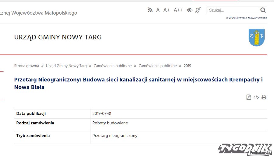 Gmina Nowy Targ ogłosiła przetarg na budowę kanalizacji dla Nowej Białej i Krempach.