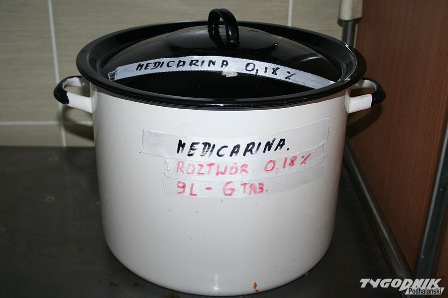 Sprzątaczka ma też funkcję kuchenkowej. Myje talerze, przygotowuje sztućce do posiłków. Zaglądam do pokoiku na chirurgii. Tu zamiast wyparzacza czy zmywarki – prawdziwe urządzenie dwudziestego pierwszego wieku. Dziesięciolitrowy gar, w którym sprzątaczka rozrabia osiemnastoprocentowy roztwór medicareny lub javelu. W tych chemikaliach płukane są talerze, na których potem lądują szpitalne dania.