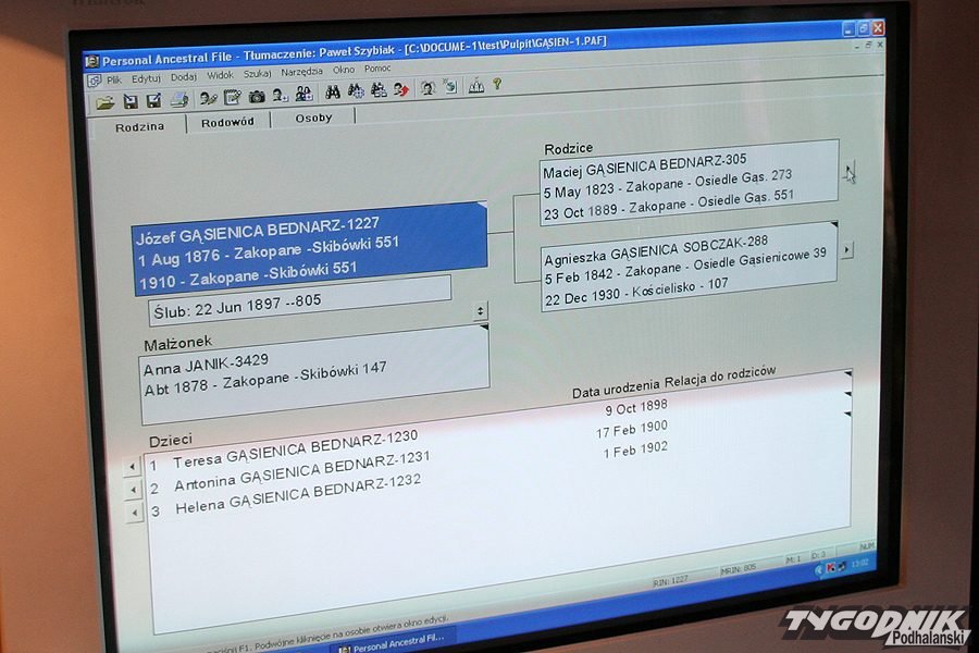 Najstarsza data – 1530 rok – należy do Piotra Kistka Kostki z Czarnego Dunajca, który z Zofią Czerwińską z Podczerwonego miał syna Piotra Gąsienicę Walczaka. Ten poślubił w lutym 1605 roku Urszulę Kalatę Sołtysiankę. Mieli szóstkę dzieci. Tak można \"klikać\" w każde nazwisko i otwierać kolejne rodowe gniazda, śledzić, jak łączą się rody, jak jedne wymierają bezpotomnie, a inne rozwijają się do dziś.