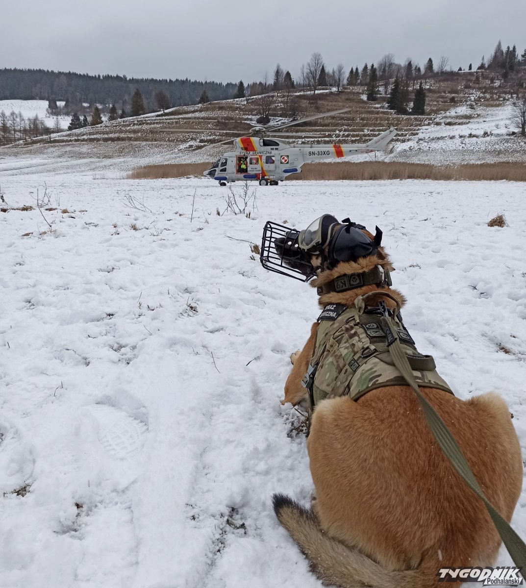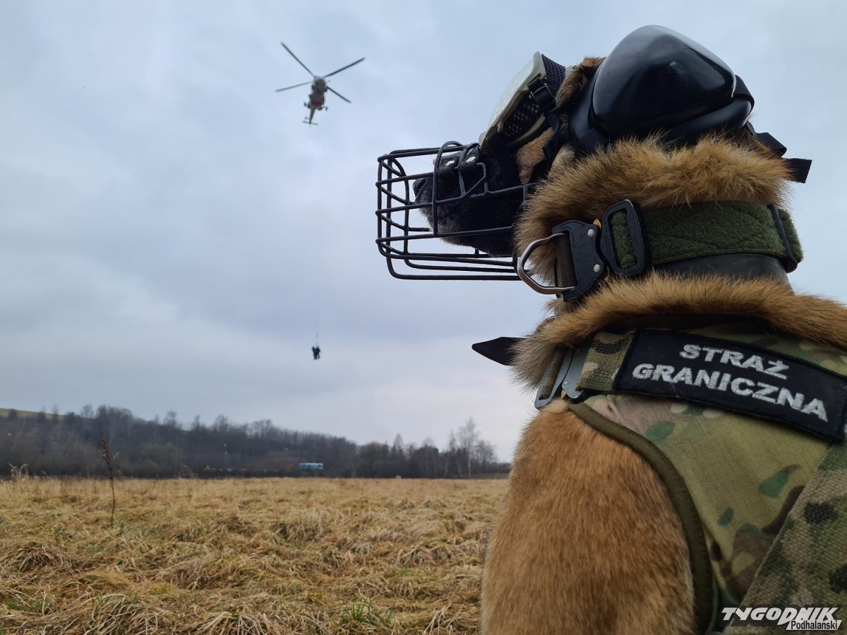Pogranicznicy i policjanci szkolili swoje umiejętności z udziałem śmigłowca. Towarzyszył im owczarek belgijski Extreme.