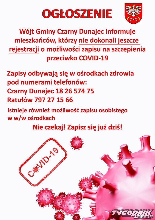 Od wtorku 6 kwietnia można zapisywać się na szczepienia w ośrodkach zdrowia w Czarnym Dunajcu i Ratułowie - informuje Marcin Ratułowski, wójt gminy.