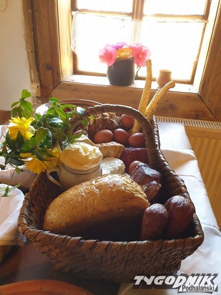 Baranka upieconego z ciasta, jojka warzone w łuskak cebuli, chlyb, odróbke siondry (szynki), krzon – duzy korzyń, masło zrobione w Wielki Piątek, wionek kiełbasy, spyrke na trzy palce, kołoc (chleb posmarowany po wiyrchu syrym i upiecony), syr, sól, rzepe (ziemniaki), mało śklonecke wody (butelkę).Kosolke, kosycek, opołke, miske drewniano albo gliniano downi ubierali miyrtom albo bruśnicniokiym. Robiły to baby i dzieci. Do środka kosołki kładli serwetke lniano albo zrobiono na sydełku z biołych nici. Na niej poukładali sytkie produkty. Ubierali sie paradnie i śli do kościoła. Miyrtom, tymu nolezało przybrać kosołke, bo tyn zielony krzocek jest symbolem Najświętszej Marii Panny. Był downi w kozdym domu na oknie. Był znakiym zycio, płodności, radości – chronił przed złym.