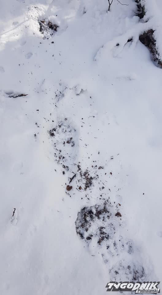 Tomasz Kotaś i Krzysztof Sarapata z Wadowic, którzy od roku pracują nad filmem o babiogórskiej przyrodzie "Szepty Lasu" dziś prowadzili pościg za niedźwiedziem, który gawrował na Babiej Górze. Niedawno się przebudził i nie daje się złapać. Zostawia tylko tropy na śniegu, niemal jak Yeti.