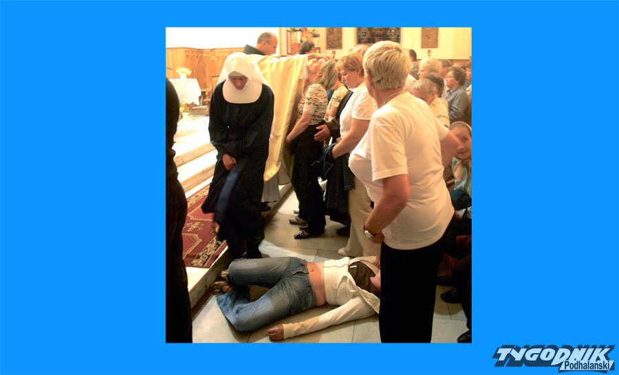 Młoda kobieta miękko osuwa się na ziemię, ktoś z tyłu podtrzymuje ją, by nie uderzyła głową o granitową posadzkę kościoła. Dziewczyna w dżinsach i jasnej bluzce leży z wyrazem błogości na ustach. Spod lekko uchylonych powiek jakby patrzyła nieobecnym wzrokiem na to, co dzieje się dookoła. To trwa kilkadziesiąt sekund, może minutę. Wstaje i odchodzi do ławki. Padają kolejni. Młodzi, starzy, nastolatki i staruszki. Bywa, że pod nogami leży kilka osób. – Nie wolno ruszać – o. Robert powstrzymuje jednego z chętnych do niesienia pomocy upadającym.