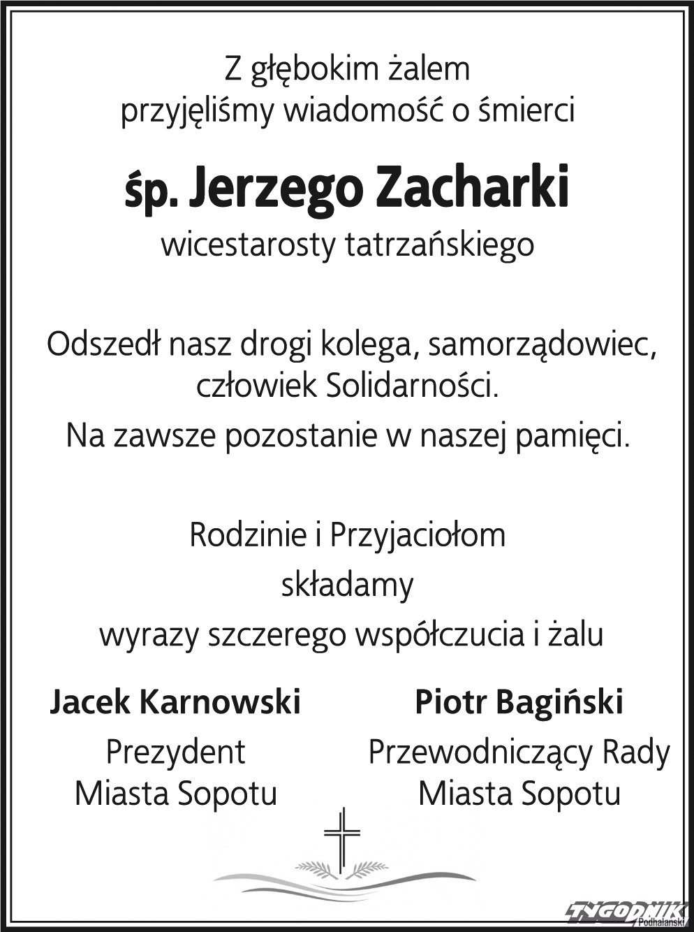 Z głębokim żalem przyjęliśmy wiadomość o śmierci śp. Jerzego Zacharki wicestarosty tatrzańskiego.