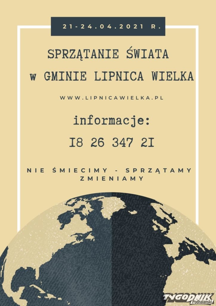 22 kwietnia obchodzony jest Światowy Dzień Ziemi. Wiele gmin, również Lipnica Wielka boryka się z problemem porozrzucanych śmieci. Zwłaszcza po zimie śmieci wyrastają jak „grzyby po deszczu”.
