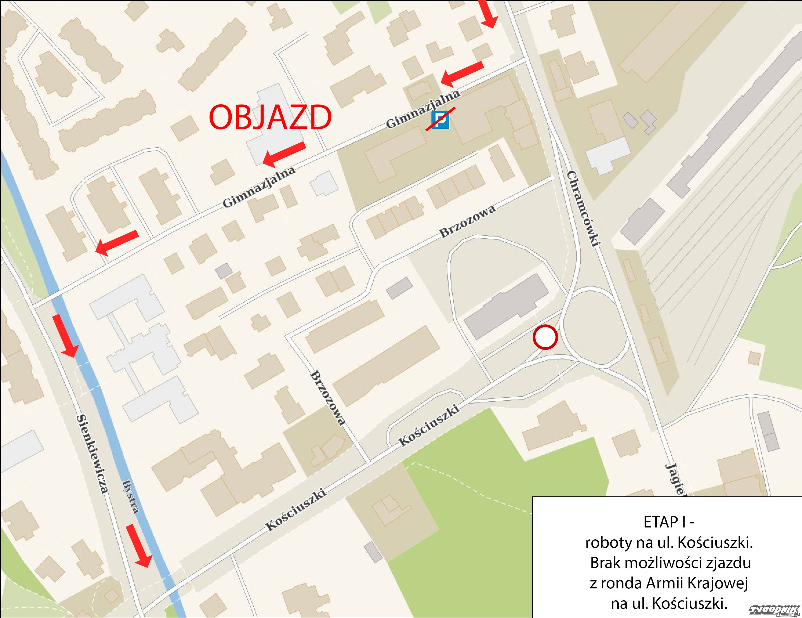 Etap I: roboty na ul. Kościuszki będą prowadzone przy zamknięciu części odcinka jezdni. Nie będzie możliwości zjazdu z ronda Armii Krajowej na ul. Kościuszki. Objazd do ul. Kościuszki wytyczono ul. Gimnazjalną, na której w celu zapewnienia bezpiecznego przejazdu wyłączone z użytkowania zostaną parkingi należące do Strefy Płatnego Parkowania położone w ciągu tej ulicy. W ramach tego etapu będą również wykonywane prace krótkotrwałe prowadzone najezdni pod ruchem związane z renowacją odcinków kanalizacji .