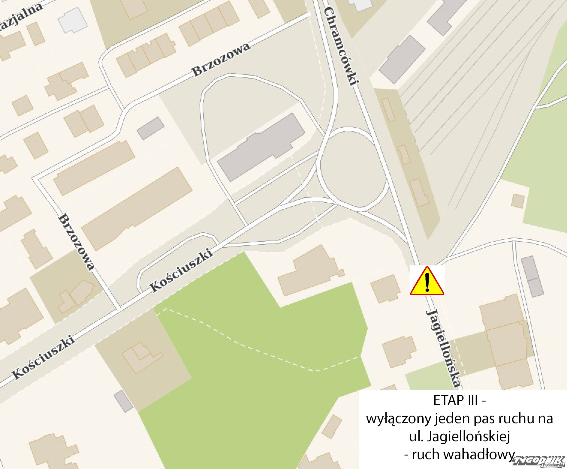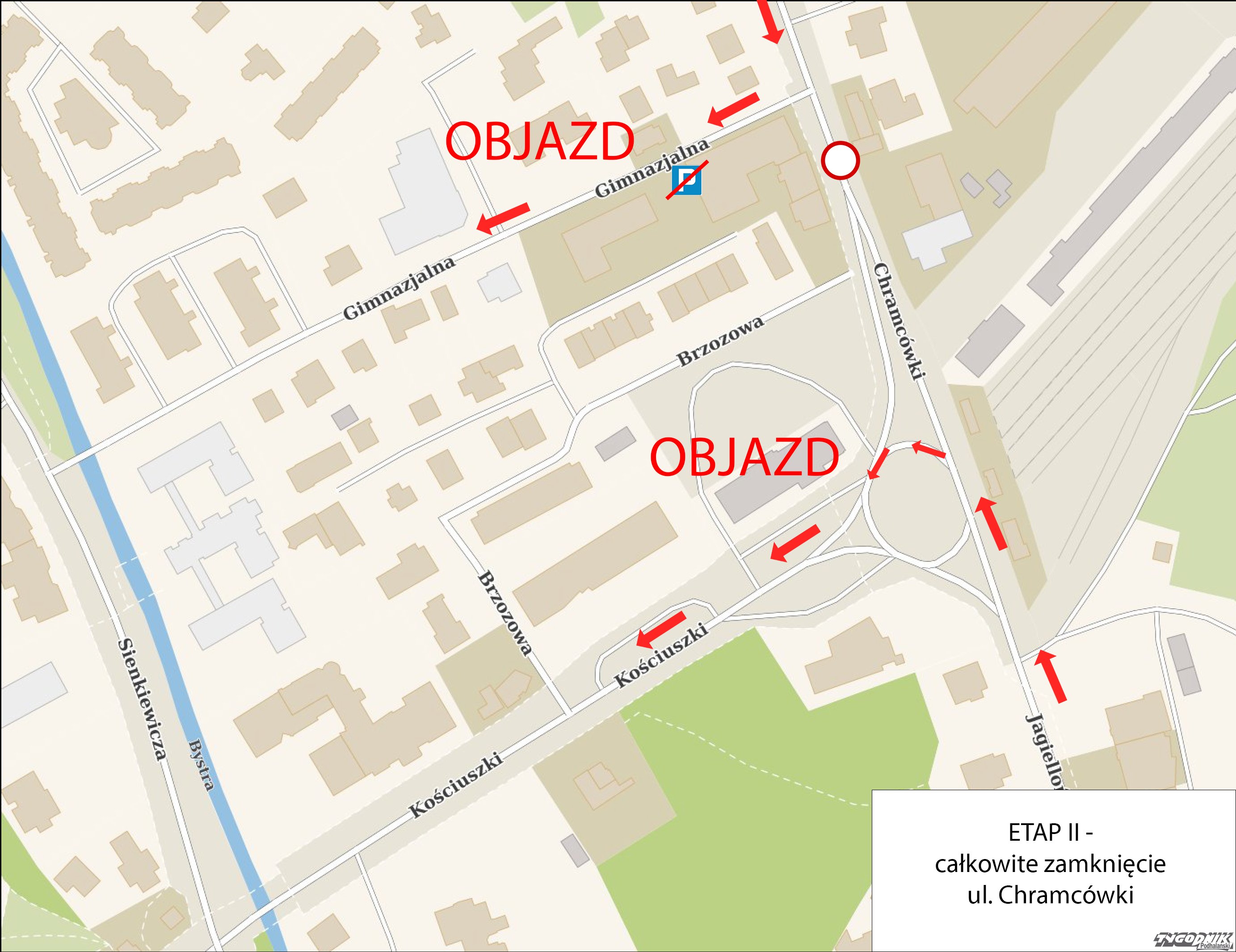 Etap II: roboty na ul. Chramcówki będą prowadzone przy zamknięciu dla ruchu odcinka ulicy między skrzyżowaniem z ul. Gimnazjalną a rondem Armii Krajowej. Objazd do ul. Kościuszki wytyczono ul. Gimnazjalną, na której w celu zapewnienia bezpiecznego przejazdu wyłączone z użytkowania zostaną parkingi należące do Strefy Płatnego Parkowania położone w ciągu tej ulicy. Zalecany dojazd do centrum miasta przez ul. Nowotarską.