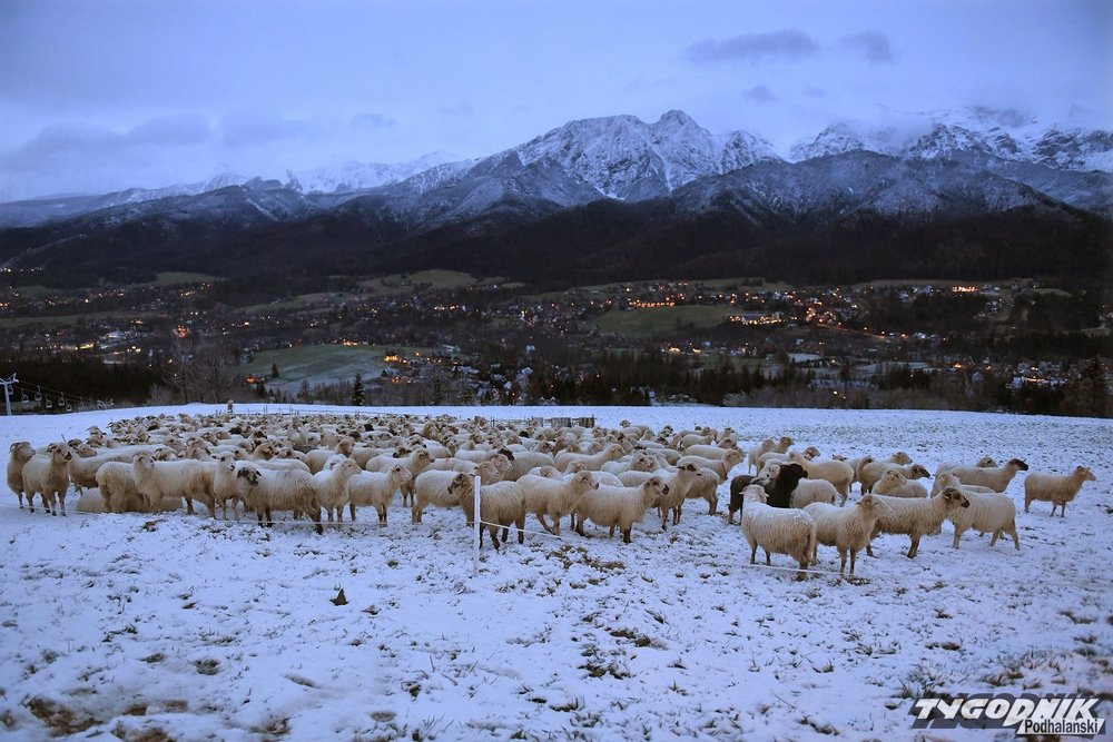 W Zakopanem i Kościelisku wieczorem sypał śnieg. Temperatura spadła do 1 st. C. W wyższych partiach Pasma Gubałówki biała warstwa pojawiła się na łąkach. Owce trochę zdezorientowane mogły podziwiać widoki na zaśnieżony Giewont. Fot. Bartłomiej Jurecki