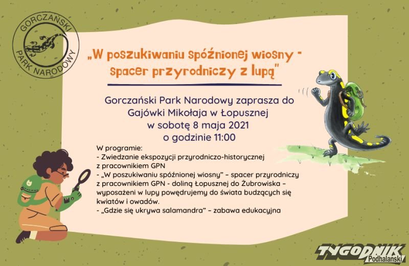 Gorczański Park Narodowy zaprasza w sobotę 8.05 do Gajówki Mikołaja w Łopusznej na zajęcia edukacyjne. Temat: "W poszukiwaniu spóźnionej wiosny - spacer przyrodniczy z lupą".