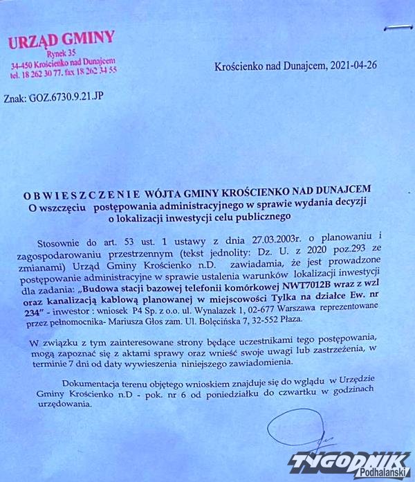 Pod koniec kwietnia na stronie urzędu gminy Krościenko i tablicach ogłoszeń pojawiła się informacja o planowanej inwestycji sieci komórkowej Play w sołectwie Tylka. Nowa stacja miała powstać w bezpośredniej lokalizacji budynków, w odległości około 350 metrów od granicy Pienińskiego Parku Narodowego, nieopodal punktu widokowego, w którym znajduje się tzw.: „grzybek turystyczny“. - To było dla nas spore zaskoczenie, praktycznie w ostatnim momencie zauważyliśmy to ogłoszenie, a w nim zapis, że mamy 7 dni na wniesienie uwag, szybko postanowiliśmy działać i tak w ciągu dwóch dni pod naszą petycją, w której wyrażamy sprzeciw, podpisało się 98 osób - mówi mieszkaniec Tylki.
