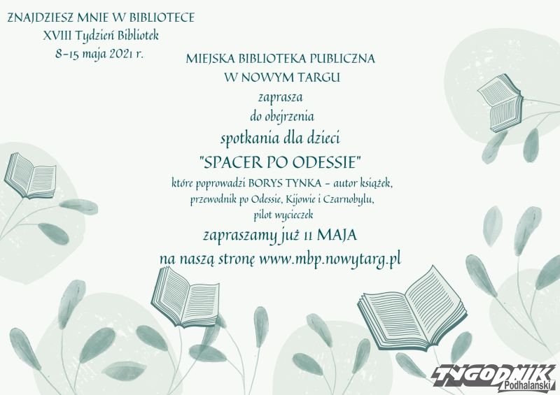 Waszym cicerone będzie Borys Tynka - autor książek, przewodnik po Odessie, Kijowie i Czarnobylu oraz pilot wycieczek. Dla starszych czytelników, wespół z biblioteką, przygotował spotkanie zatytułowane „Podróże literackie”. Młodszych zabierze na „Spacer po Odessie”.
