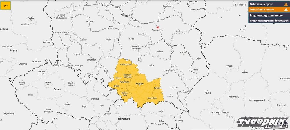 Ostrzeżenie przed intensywnymi opadami deszczu pierwszego stopnia (w trzystopniowej rosnącej skali) obowiązuje dla powiatu tatrzańskiego i nowotarskiego. Deszcz ma zacząć obficie padać dziś ok. godz. 18, a opady będą zanikać we wtorek po godz. 14. Na Podhalu spadnie od 30 do 50 mm.