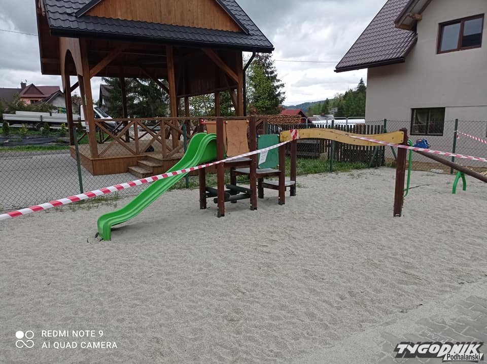 Na placu zabaw w Krośnicy pojawiły się biało-czerwone taśmy.