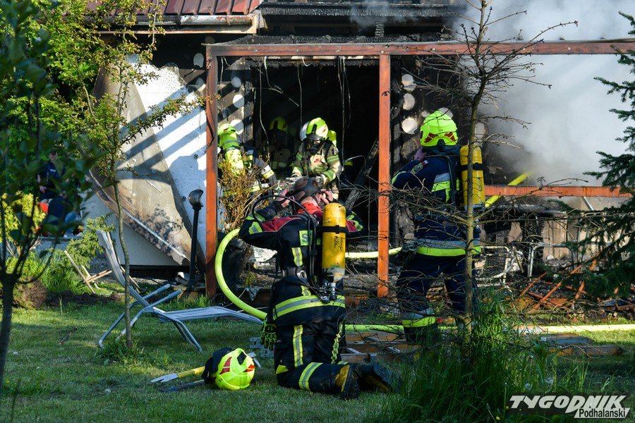 Na miejscu jest kilka strażackich zastępów i ekipa pogotowia ratunkowego, która udzieliła pomocy poszkodowanemu mężczyźnie. Do gwałtownego pożaru doszło w osadzie domków, która należy do PKP. Pożar wybuchł w drewnianej altance znajdującej się tuż przy domku do wynajęcia. Rozprzestrzenił się bardzo szybko. Płomienie dostały się do wnętrza domku.