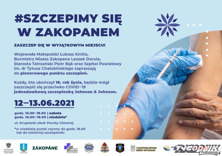 W Zakopanem w sobotę 12 czerwca o godz. 10 otwarty zostanie plenerowy punkt szczepień. Powstanie na Krupówkach na wysokości budynku poczty. Chętni mogą się zaszczepić przeciw COVID-19 pod warunkiem, że ukończyli 18. rok życia.