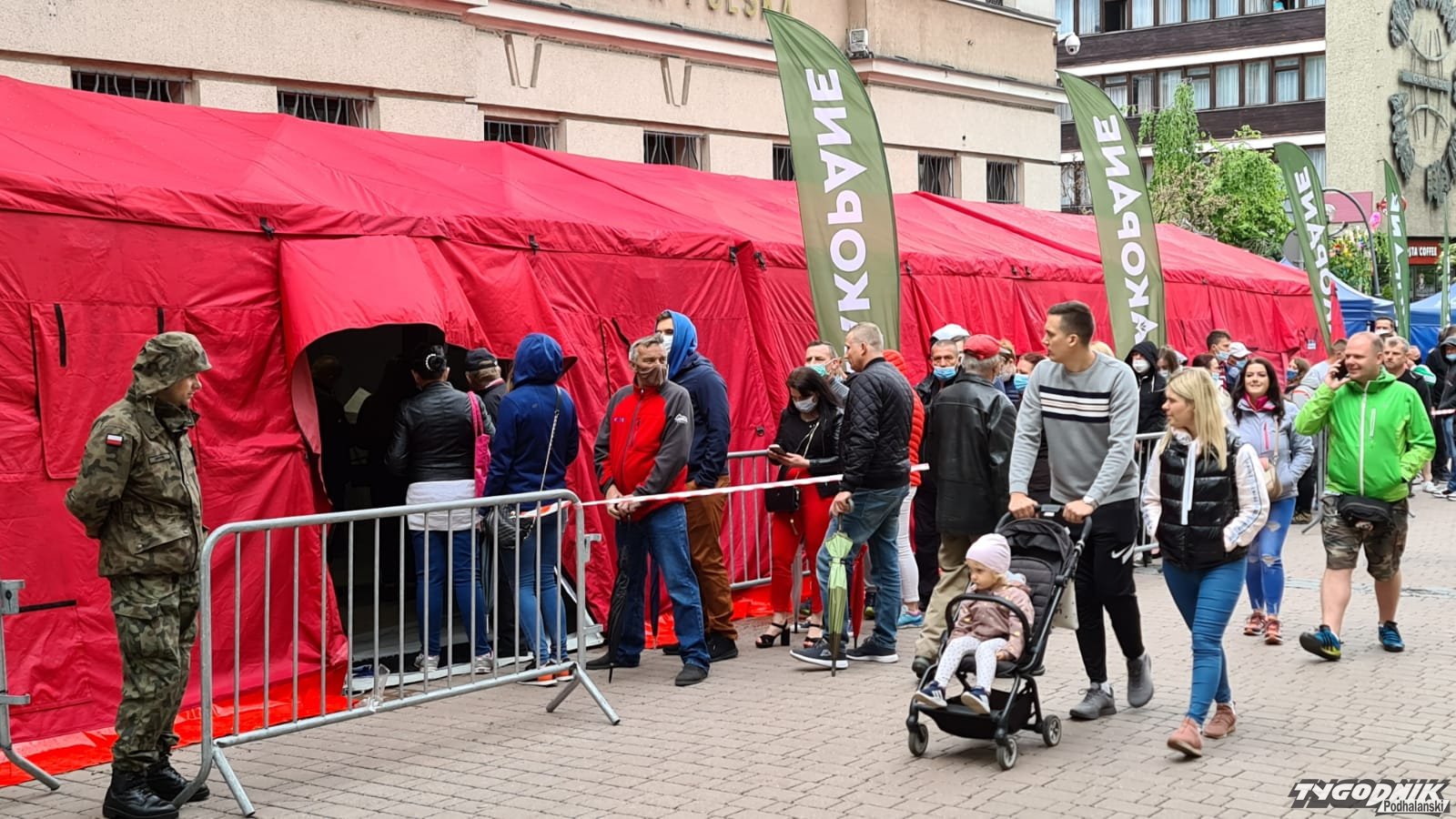 Uczestniczy w konferencji prasowej związanej z akcją szczepień.