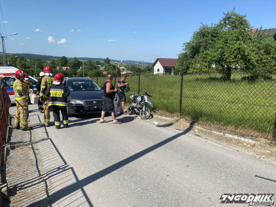 Wypadek zdarzył się tuż przed piętnastą w Spytkowicach, na drodze lokalnej koło Urzędu Gminy. Siła uderzenia była dość duża. W aucie pękła szyba czołowa. Motocyklem kierował nastolatek. Młody kierowca był przytomny, gdy zabierała go do szpitala karetka pogotowia.
