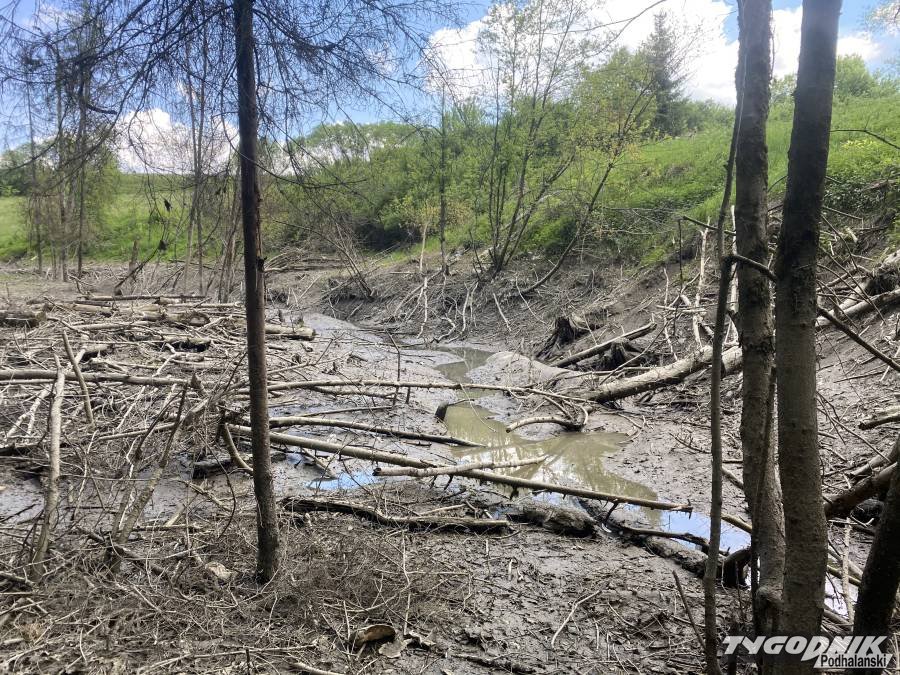 To był naprawdę spory zalew i całkiem głęboki. Głębokość wody w niektórych miejscach sięgała dwóch metrów. Niestety kilka tygodniu temu woda zeszła dosłownie z dnia na dzień. Na miejscu nie widać, by do tej bobrzej katastrofy przyczynił się człowiek. Tym razem sławny inżynierski kunszt wielkich gryzoni się chyba nie potwierdził. Ale spokojnie... Bobry mają w sąsiedztwie kilka innych mniejszych bajorek, zapewne sobie poradzą…