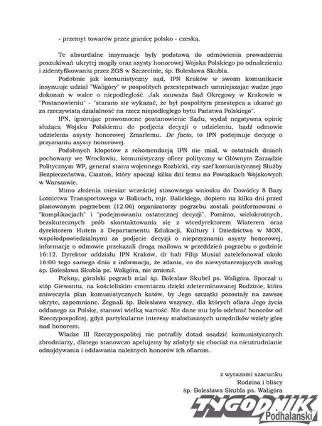 Rodzina i bliscy oraz rodziny Żołnierzy Wyklętych podpisały się pod listem otwartym do Prezydenta RP, w którym protestują przeciwko szkalowaniu dobrego imienia śp. Bolesława Skubla ps. "Waligóra" oraz blokowaniu poszukiwań i odmówienia pełnej asysty honorowej Wojska Polskiego podczas pogrzebu.