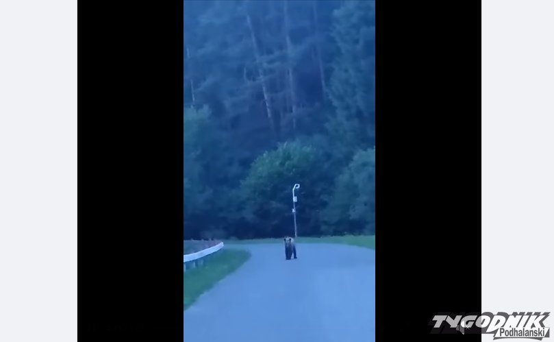 Młody niedźwiedź spaceruje po drodze w Sromowcach Wyżnych (WIDEO)