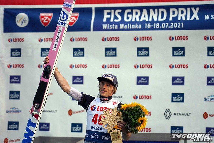 To były wspaniałe zawody dla reprezentantów Polski, którzy zdominowali rywalizację na Skoczni w Wiśle-Malince. Pierwsze w karierze zwycięstwo w zawodach najwyższej rangi odniósł Jakub Wolny. Podopieczny Michała Doleżala oddał skoki na odległość 123,5 oraz 126,5 metra i tym samym mógł cieszyć się z pierwszego w karierze miejsca na podium w zawodach FIS Grand Prix. - Dzisiaj starałem się bawić skokami i wiedziałem, że stać mnie na dobre skoki i że aktualnie jestem w dobrej dyspozycji. Myślę, że udało mi się to pokazać i nie zamierzam nikomu oddawać plastronu lidera - ocenił swój występ najlepszy zawodnik sobotniego konkursu. - To było fantastyczne uczucie, że przy tylu kibicach mogliśmy zaśpiewać nasz hymn narodowy. Hymn był taki sam jak podczas zwycięstwa z drużyną, jednak kiedy stoisz sam na najwyższym stopniu podium, to jest to zupełnie inne uczucie. Jedno i drugie ma swoją wartość, ale wydaje mi się, że dla samego zawodnika zwycięstwo indywidualne ma większą wartość - dodał. - Moje zwycięstwo to sukces także całej drużyny, bo taką atmosferę jaką my mamy w teamie, ma mało która nacja. Jutro znów dam z siebie wszystko i zobaczymy, jaki będzie tego rezultat. Chciałbym podziękować również kibicom, którzy wspaniale nas dzisiaj wspierali - zaznaczył Wolny.