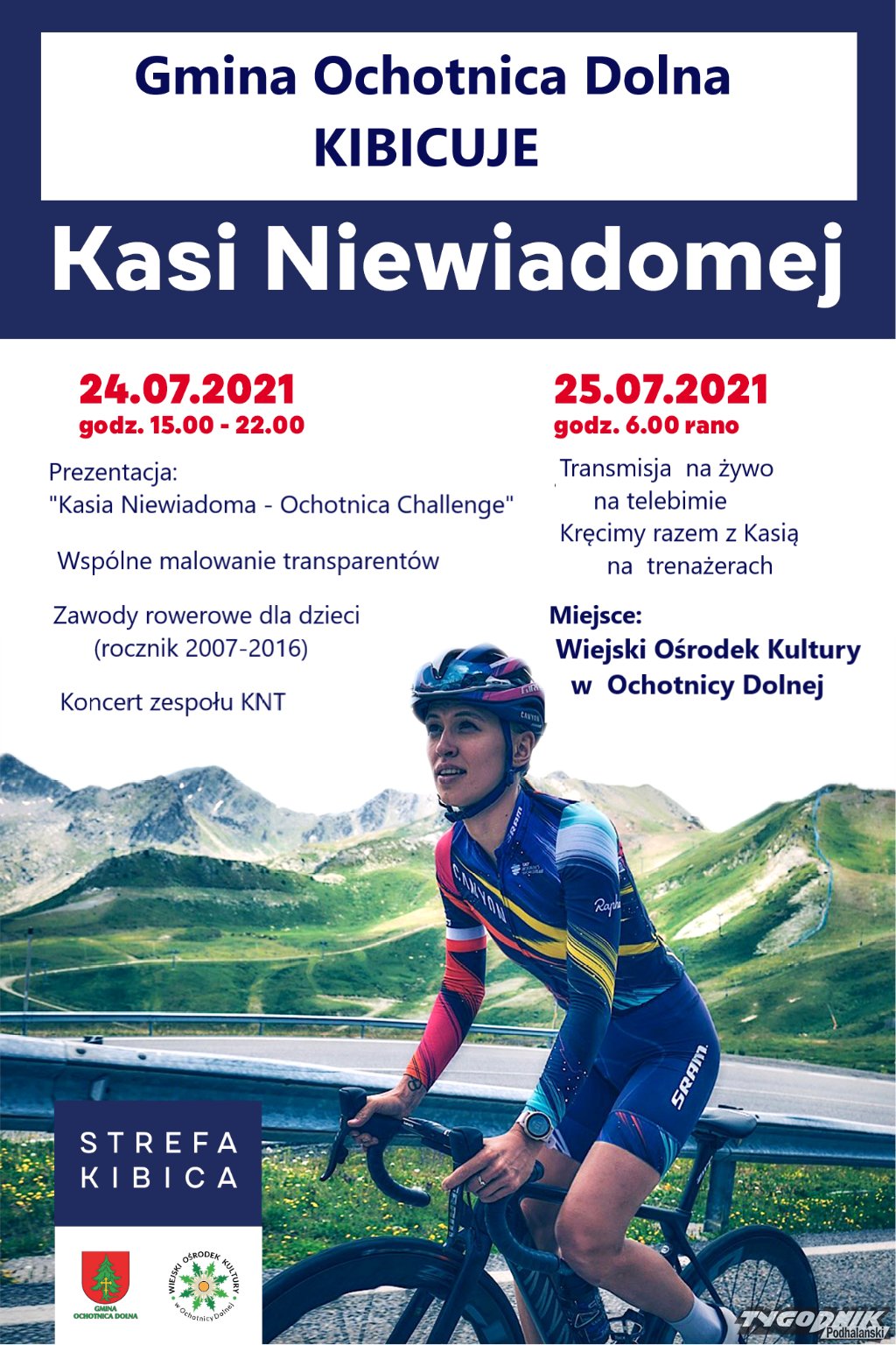 Projekt tej nietuzinkowej trasy ma być przedstawiony w specjalnej Strefie Kibica zorganizowanej przy WOK-u w Ochotnicy Dolnej, która wystartuje w sobotę 24 lipca o godz. 15. - Rozpoczynamy kibicowanie dzień wcześniej, przed startem Kasi, bo chcemy jej przekazać dużą dawkę pozytywnej energii. Zależy nam na tym, by wiedziała, że z nią jesteśmy - tłumaczy wójt, zapraszając wszystkich do Ochotnicy. - Będzie biało-czerwono i pozytywnie - dodaje Monika Jagieła, dyrektor Wiejskiego Ośrodka Kultury w Ochotnicy Dolnej. Co się szykuje? Dzieci będą mogły wystartować w zawodach rowerowych, a dorośli posłuchać dobrej muzyki i włączyć się w szykowanie transparentów (więcej szczegółów na plakacie).