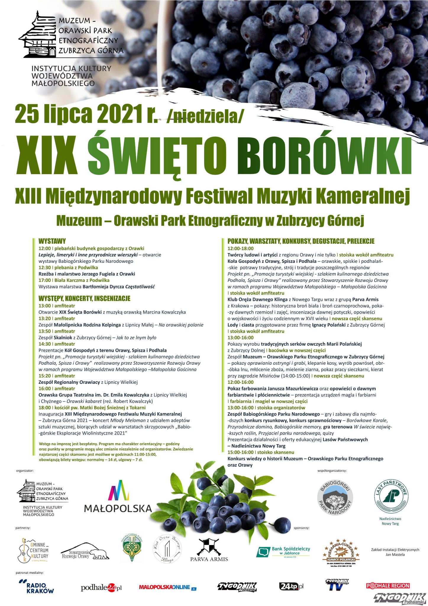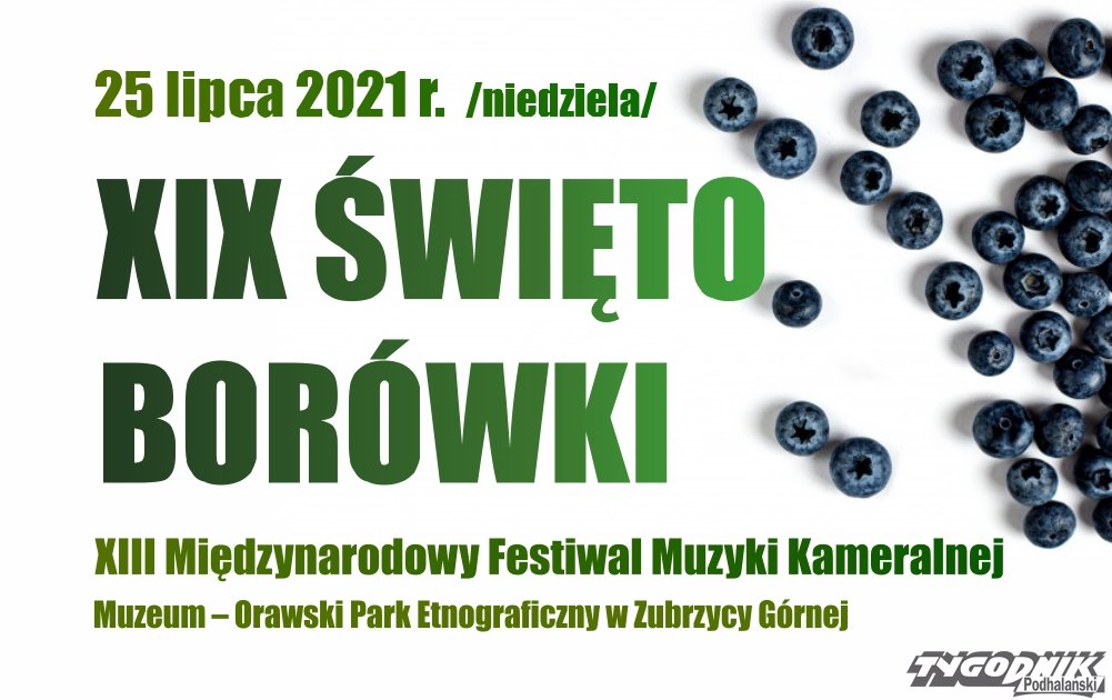 Muzeum – Orawski Park Etnograficzny w Zubrzycy Górnej przygotowało plenerowe spotkanie z muzyką i kulturą ludową. W niedzielę, 25 lipca, powraca największa doroczna impreza plenerowa organizowana przez skansen, czyli Święto Borówki. Jej część muzyczną wypełnią: występy lokalnych wykonawców m.in. zespołu "Skalniok" i Zespołu Regionalnego "Orawiacy" oraz koncert inaugurujący XIII Międzynarodowy Festiwal Muzyki Kameralnej, z udziałem uczestników babiogórskich warsztatów skrzypcowych. Zaplanowano też otwarcie w skansenie trzech nowych wystaw malarstwa oraz inscenizację Orawskiej Grupy Teatralnej. Festiwalowi będą towarzyszyć jak zawsze pokazy warsztatowe różnych zajęć gospodarskich, degustacje dań regionalnych oraz prezentacje grup historycznej.