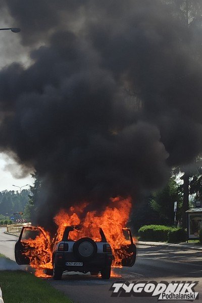 Strażacy interweniują przy płonącym aucie terenowym na Alejach Tysiąclecia w Nowym Targu.