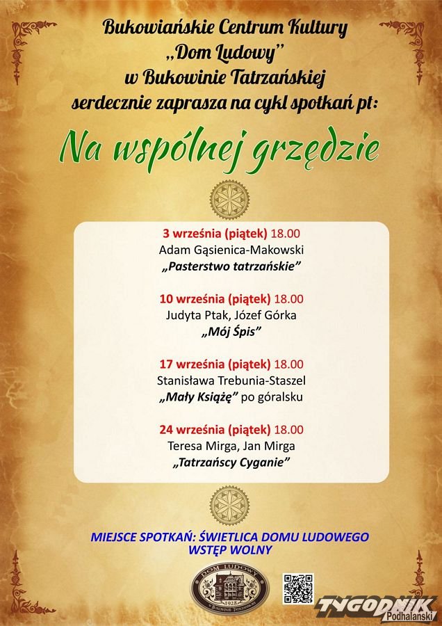 W najbliższy piątek 3 września Adam Gąsienica Makowski opowie o pasterstwie tatrzańskim. Tydzień później - 10 września - bohaterami spotkania będą Judyta Ptak i Józef Górka, a tematem "Mój Śpis". W piątek 17 września Stanisława Trebunia-Staszel i "Mały Książę po góralsku". Gośćmi ostatniego spotkania z cyklu "Na wspólnej grzędzie" będą Teresa Mirga i Jan Mirga. Opowiedzą o "Tatrzańskich Cyganach".