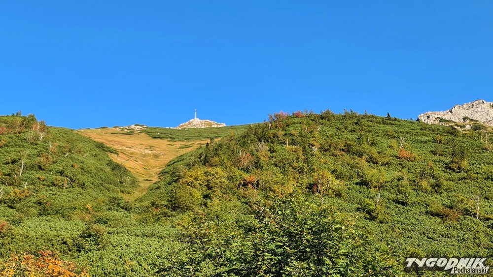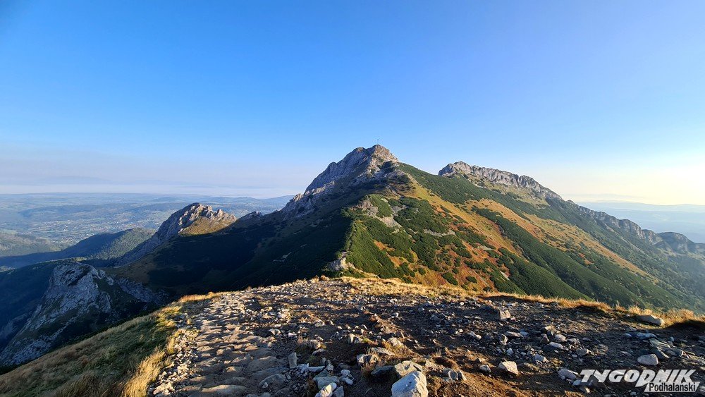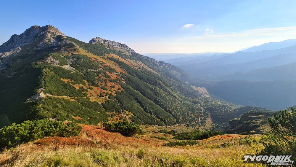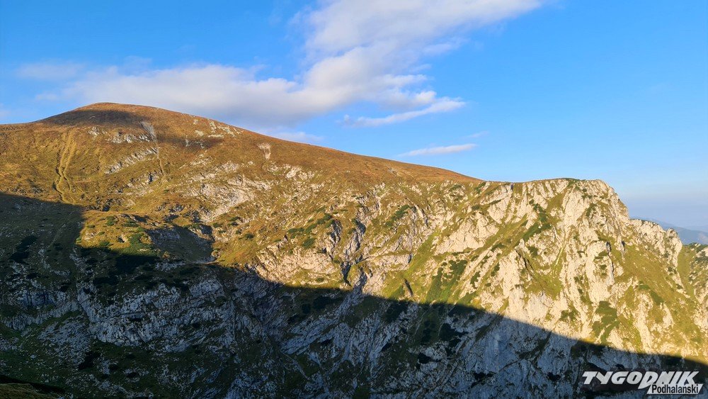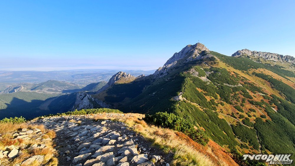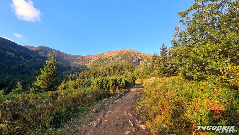 Przełęcz Kondracka oddziela Giewont od Kopy Kondrackiej. Śpiący rycerz wygląda stąd nietypowo, mniej groźnie. Po 6 rano na szlaku z Kuźnic spotykamy tylko kilku turystów, już jednak wracając widać, że na Giewont i Czerwone Wierchy wybiera się dużo osób. Niestety, środa jest ostatnim - do poniedziałku - pięknym wrześniowym dniem. Już w czwartek więcej chmur, od piątku ochłodzenie i opady deszczu.