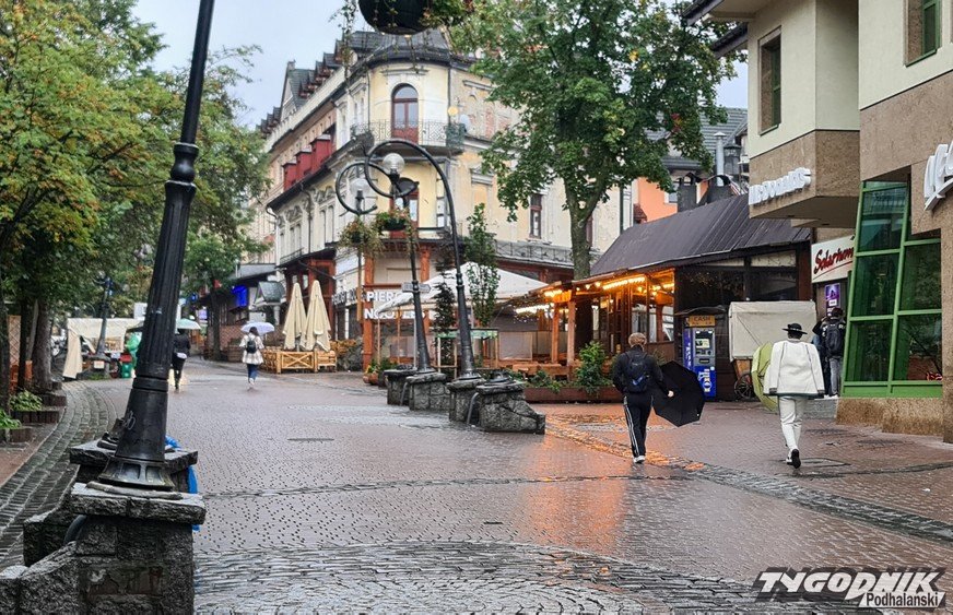 Wczoraj publikowaliśmy ostrzeżenie przed silnym deszczem. Prognozy się sprawdziły i od rana mamy intensywne opady. Deszcz będzie jednak zanikać już w godzinach popołudniowych. W sobotę i niedzielę mniej deszczu, ale na słońce nie mamy co liczyć. Ochłodzi się, maksymalne temperatury w Zakopanem nie będą przekraczać 11 st. C. Poprawa pogody we wtorek i wtedy czeka nas kilka słonecznych dni. Na zdjęciu deszczowe Krupówki.