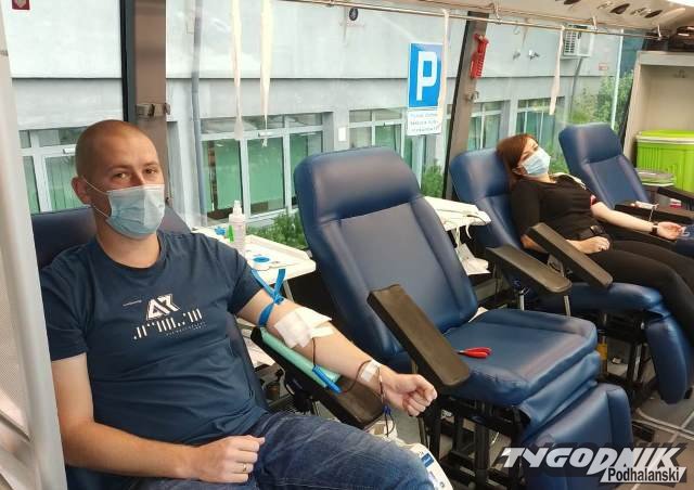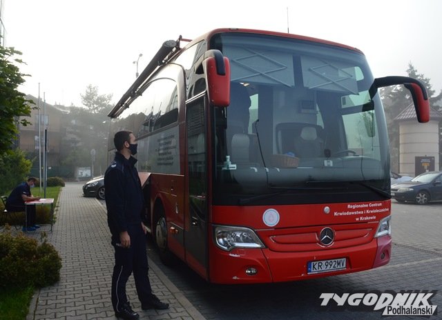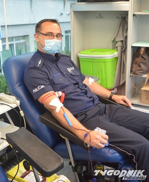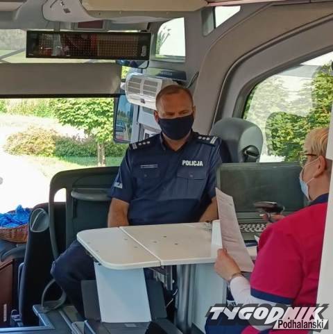 Przed nowotarską komendę zajechał krwiobus - funkcjonariusze honorowo dali sobie utoczyć krwi.
