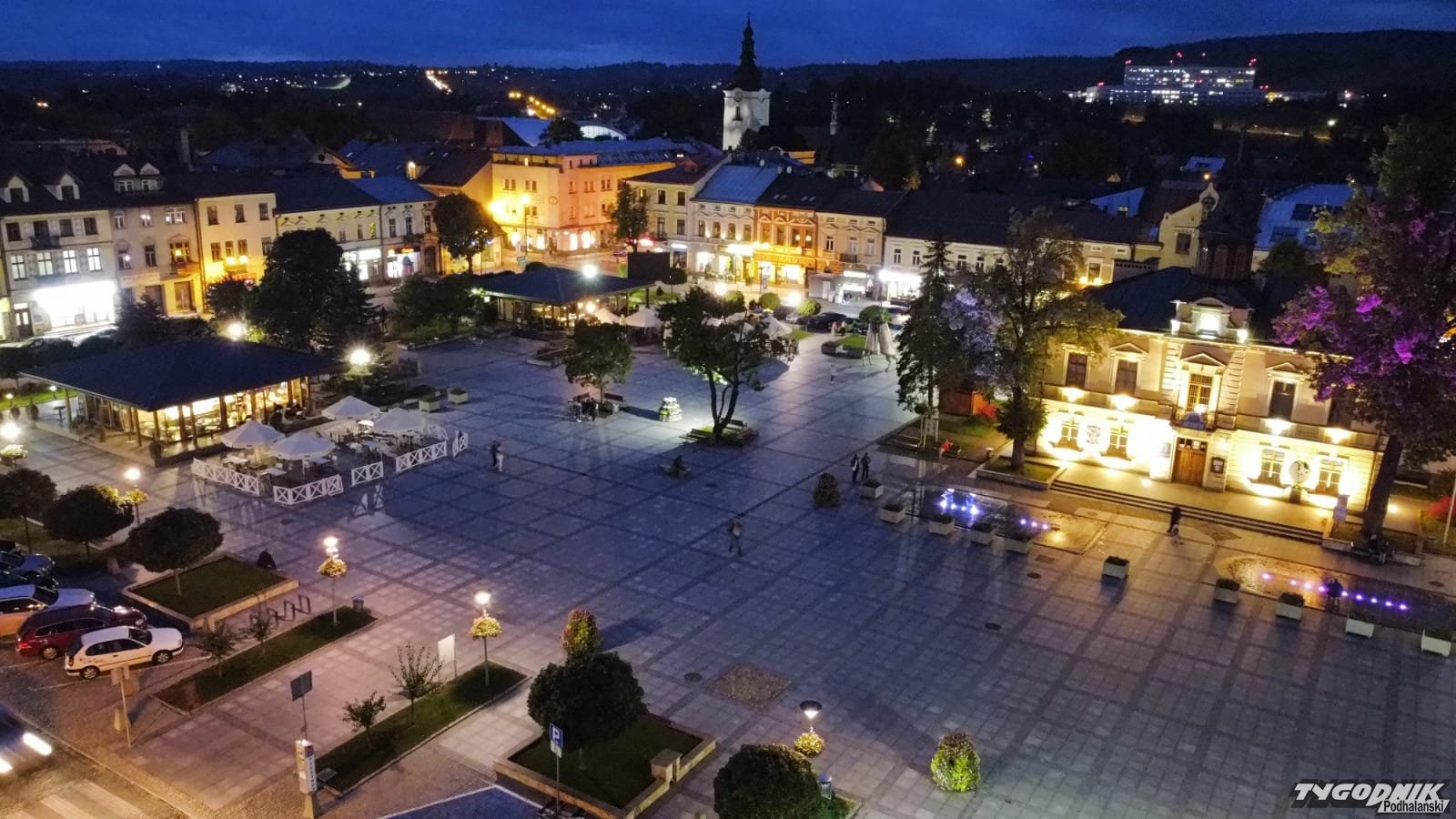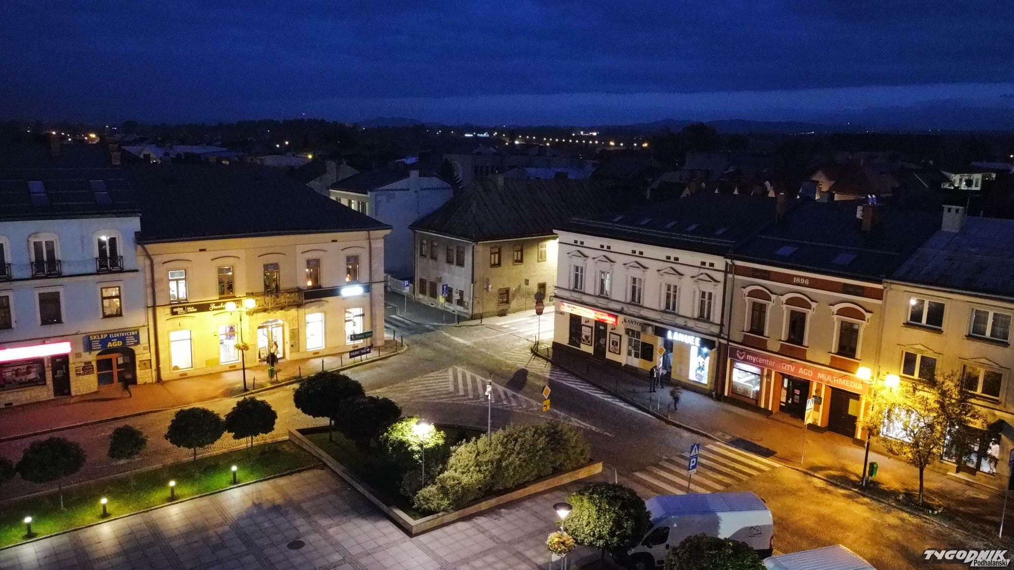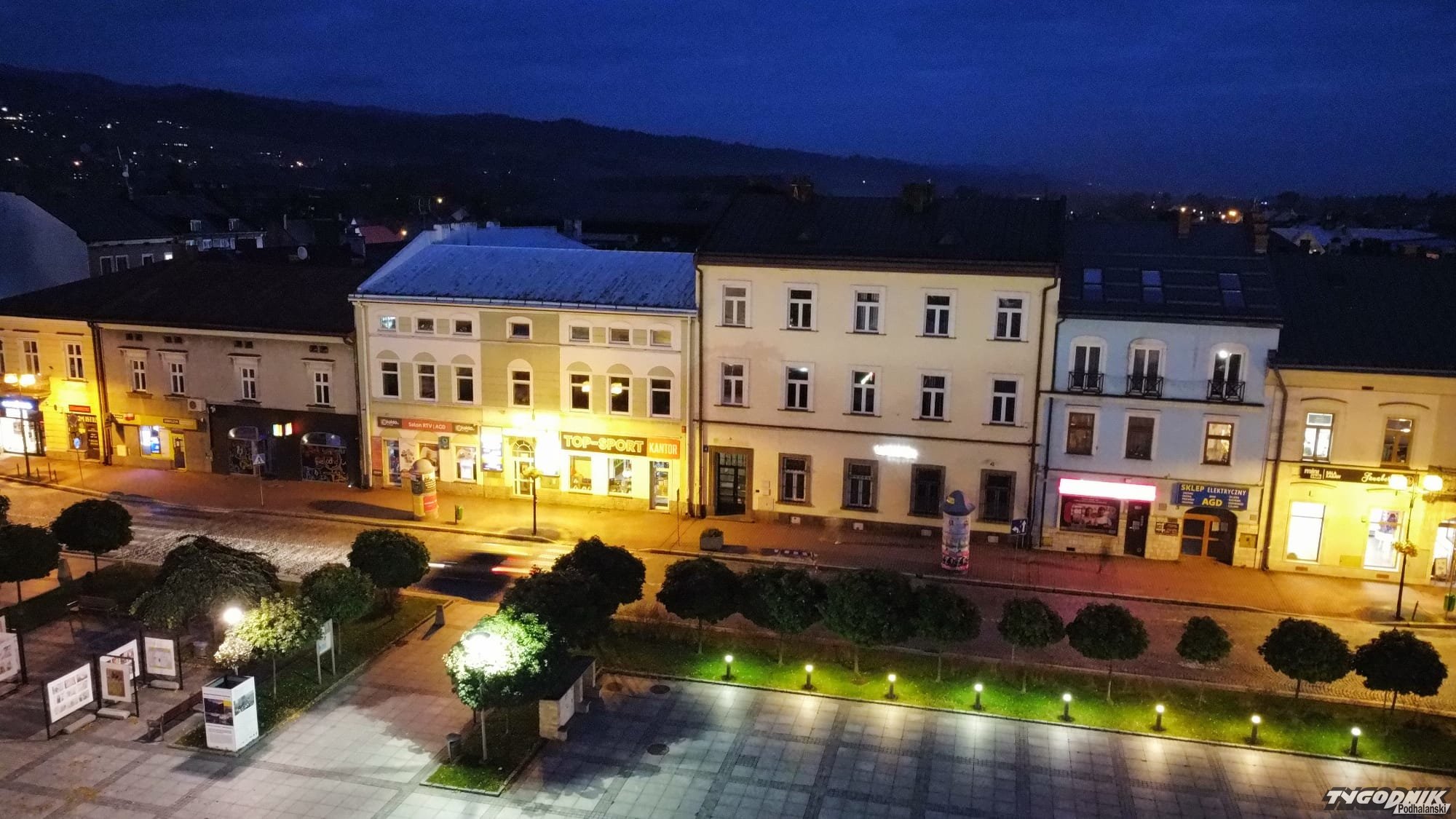 Nastrojowy wieczór w Nowym Targu. Rynek świeci pustkami