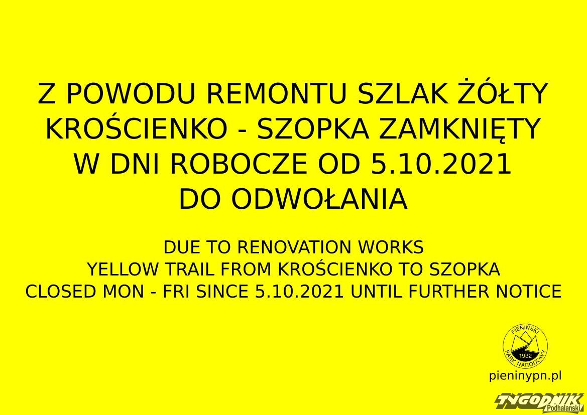 Pieniński Park Narodowy informuje, że z powodu remontu szlak żółty od Krościenka do przełęczy Szopka jest zamknięty od 5.10.2021 roku do odwołania. W weekendy można z niego korzystać!