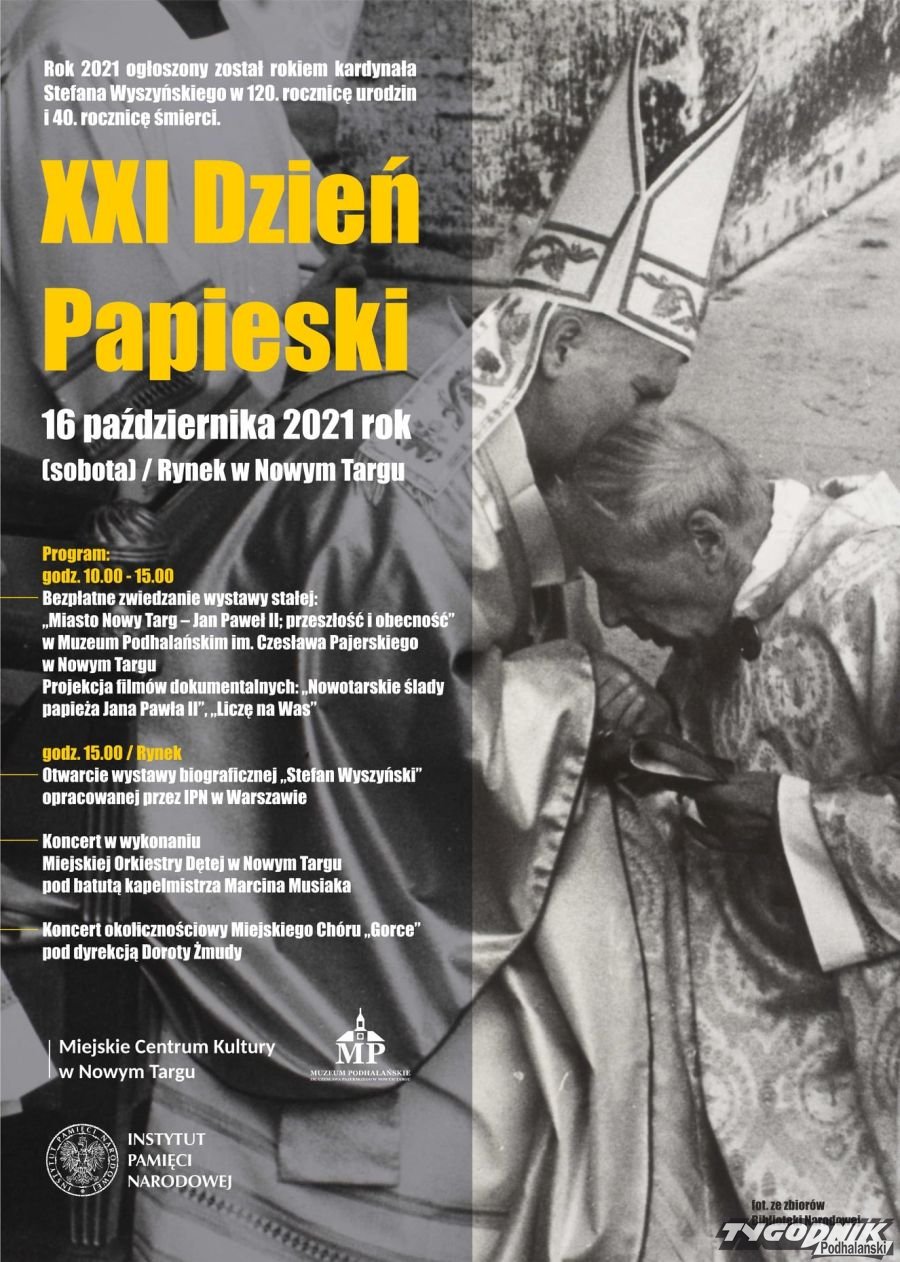 Najważniejsza część Dnia Papieskiego będzie miała miejsce na nowotarskim Rynku. To tutaj o godzinie 15 zaprezentowana zostanie wystawa biograficzna "Stefan Wyszyński", opracowana przez IPN w Warszawie. Temu wydarzeniu towarzyszyć będzie koncert w wykonaniu Miejskiej Orkiestry Dętej pod batutą kapelmistrza Marcina Musiaka oraz koncert okolicznościowy Miejskiego Chóru Gorce pod dyrekcją Doroty Żmudy.