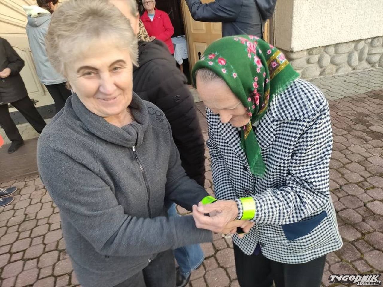 Ważną grupę pieszych stanowią seniorzy, którzy w ciemnych ubraniach są bardzo słabo widoczni po zmroku. Dzięki rozdanym odblaskom nastąpi niewątpliwie poprawa ich bezpieczeństwa w drodze na wieczorne nabożeństwa czy na zakupy w sklepie.