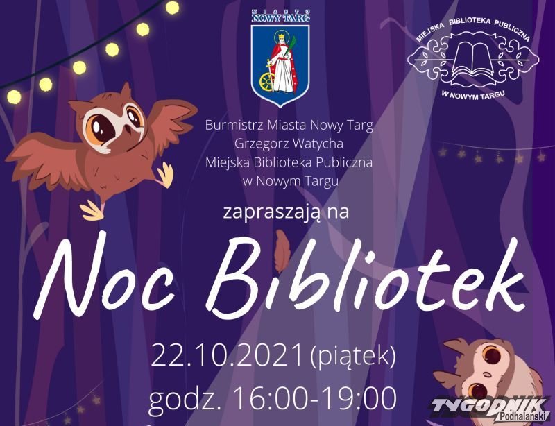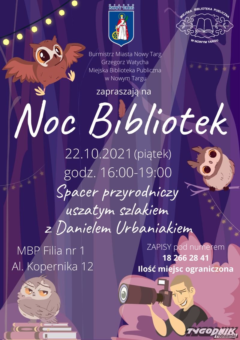 Wyjątkowo w piątek 22.10 Miejska Biblioteka Publiczna w Nowym Targu zaprasza na Noc Bibliotek do Filii nr 1 przy al. Kopernika 12. W planach spacer przyrodniczy uszatym szlakiem, na który zdecydowanie warto wcześniej się zapisać.