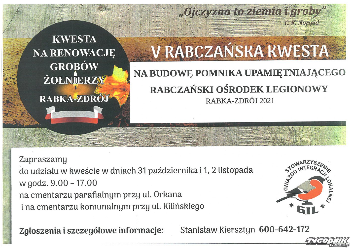 Od 31 października do 02 listopada (niedziela, poniedziałek, wtorek) wolontariusze będą zbierać pieniądze na budowę pomnika upamiętniającego rabczański Ośrodek Legionowy.