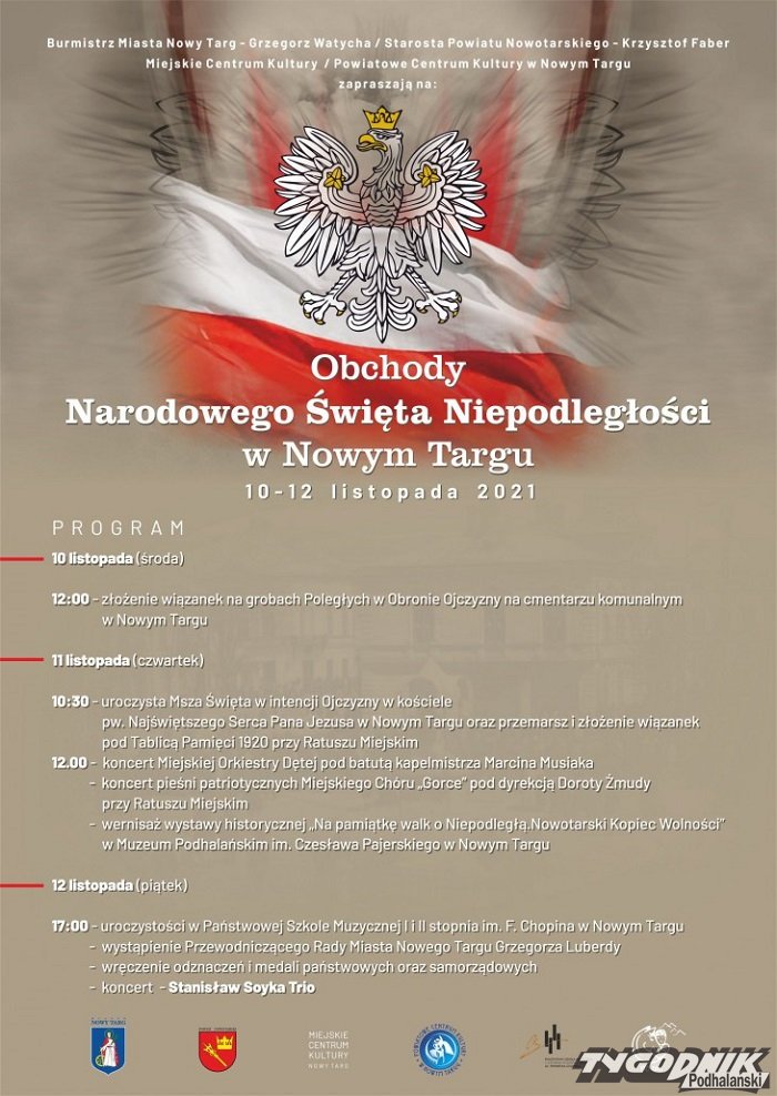 Główne obchody 11 Listopada rozpoczną się tradycyjnie Mszą św. za Ojczyznę o godz. 10.30 w kościele Najświętszego Serca Pana Jezusa. Po nabożeństwie uczestnicy przejdą przed Ratusz, gdzie koncert da Orkiestra Miejska pod batutą Marcina Musiaka, a potem nastąpi wspólne śpiewanie pieśni patriotycznych wraz z chórem Gorce pod dyrekcją Doroty Żmudy.